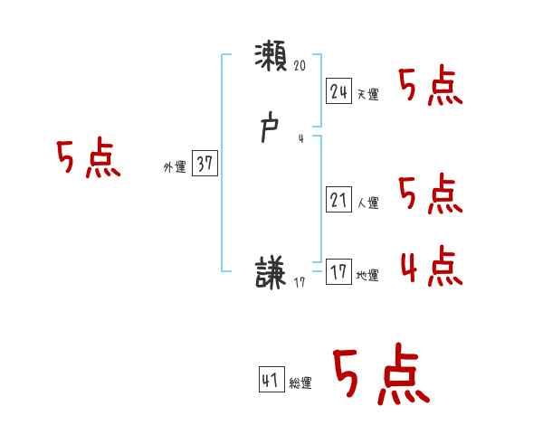天運![]() | 瀬戸謙さんの天運は24画の5つ星!家庭運が良く順調な人生。金運にも恵まれる。 家系が持つ宿命的な運勢を表します。祖先から受け継いだ苗字ですので自分の力が及びません。家柄を象徴します。 |
