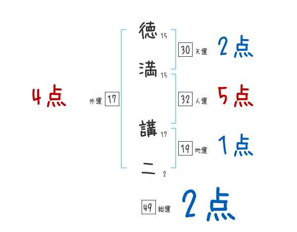 天運![]() | 徳満講二さんの天運は30画の2つ星!浮き沈みの激しさに注意しましょう。 家系が持つ宿命的な運勢を表します。祖先から受け継いだ苗字ですので自分の力が及びません。家柄を象徴します。 |