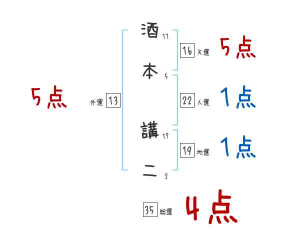 天運![]() | 酒本講二さんの天運は16画の5つ星!人望が厚く大きく発展する。逆転成功が見える。 家系が持つ宿命的な運勢を表します。祖先から受け継いだ苗字ですので自分の力が及びません。家柄を象徴します。 |