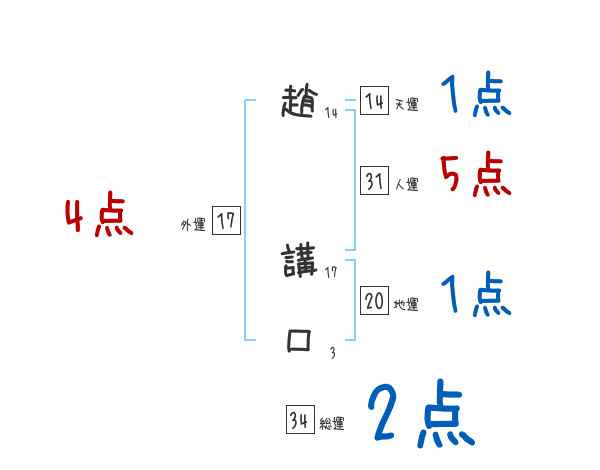 天運![]() | 趙講口さんの天運は14画の1つ星!人に対して優しいがストレスを溜め込みがち。人間関係のトラブルを避けるよう気をつけましょう。 家系が持つ宿命的な運勢を表します。祖先から受け継いだ苗字ですので自分の力が及びません。家柄を象徴します。 |