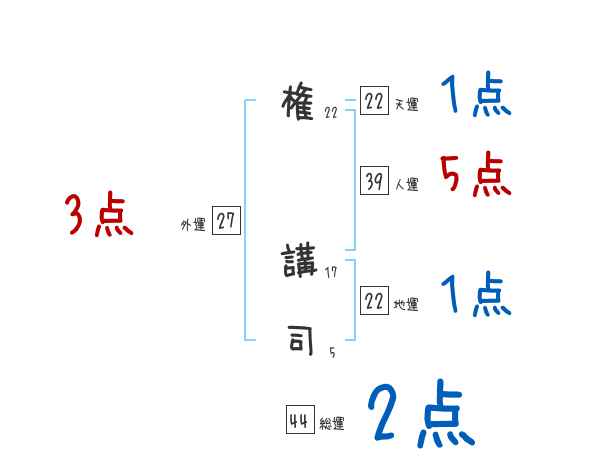 天運![]() | 権講司さんの天運は22画の1つ星!努力することが苦手ないっぽう手先が器用。芸術性にも優れる。 家系が持つ宿命的な運勢を表します。祖先から受け継いだ苗字ですので自分の力が及びません。家柄を象徴します。 |