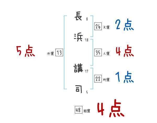 天運![]() | 長浜講司さんの天運は26画の2つ星!波瀾万丈かも。信頼できる人を大事にしましょう。 家系が持つ宿命的な運勢を表します。祖先から受け継いだ苗字ですので自分の力が及びません。家柄を象徴します。 |