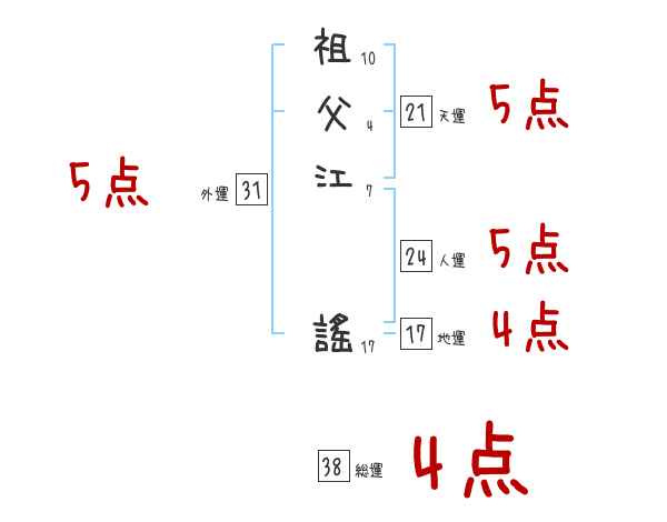 人運![]() | 祖父江謠さんの人運は24画の5つ星!家庭運が良く順調な人生。金運にも恵まれる。 性格や才能などを表す2番目に重要な運勢です。人間関係や協調性、社会的な成功に影響します。主に20歳から50歳ぐらいまでの中年期の運勢を表します。 |