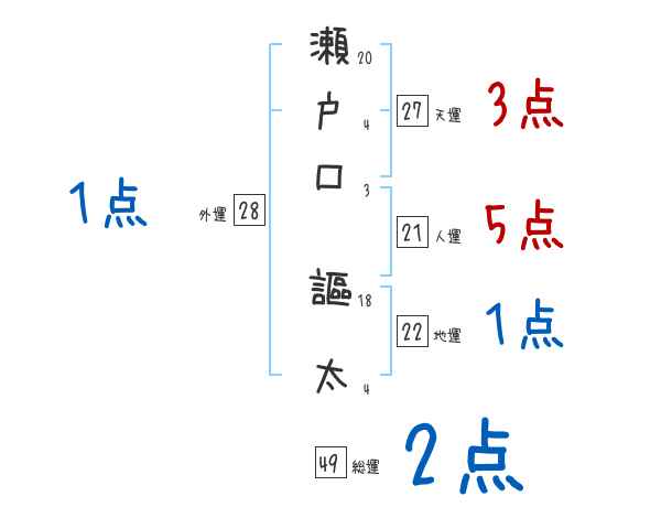 天運![]() | 瀬戸口謳太さんの天運は27画の3つ星!頭脳明晰だが強情で摩擦が多い傾向。孤立に注意。 家系が持つ宿命的な運勢を表します。祖先から受け継いだ苗字ですので自分の力が及びません。家柄を象徴します。 |