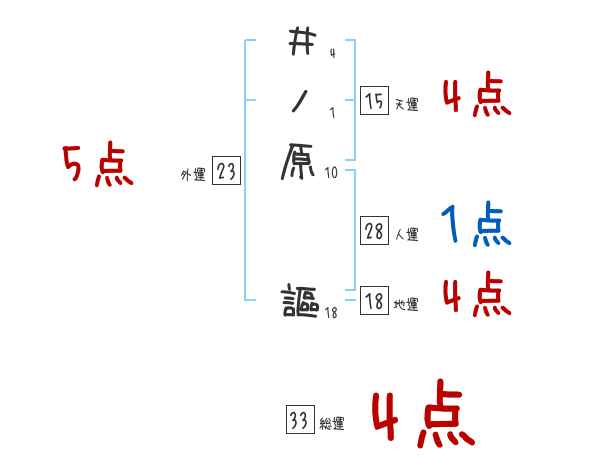 外運![]() | 井ノ原謳さんの外運は23画の5つ星!想像力に優れ活力がある。一代で成功し名誉を手に入れる。 生活面を象徴する運勢です。外部から受ける影響力を表し、結婚運、家庭運や職場、環境への順応性を表します。 |