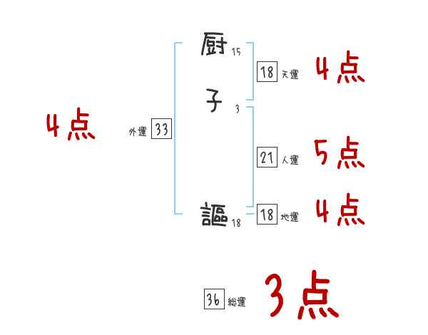 外運![]() | 厨子謳さんの外運は33画の4つ星!権力志向でプライドが高い。勇気があり運を切り開き成功する。 生活面を象徴する運勢です。外部から受ける影響力を表し、結婚運、家庭運や職場、環境への順応性を表します。 |