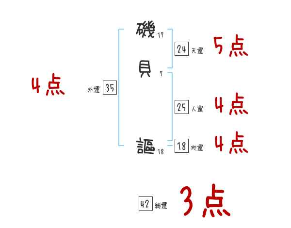 外運![]() | 磯貝謳さんの外運は35画の4つ星!温厚な性格で感受性が高い。穏和な性格で人望が厚い。 生活面を象徴する運勢です。外部から受ける影響力を表し、結婚運、家庭運や職場、環境への順応性を表します。 |
