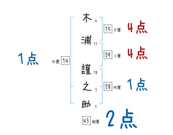 外運![]() | 木浦謹之助さんの外運は14画の1つ星!人に対して優しいがストレスを溜め込みがち。人間関係のトラブルを避けるよう気をつけましょう。 生活面を象徴する運勢です。外部から受ける影響力を表し、結婚運、家庭運や職場、環境への順応性を表します。 |