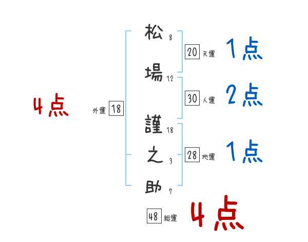 地運![]() | 松場謹之助さんの地運は28画の1つ星!家庭環境に注意。スポーツで活躍できる能力があるかも。 個性を表す基礎的な運勢です。性格形成や対人関係、行動力など家庭環境に影響されます。主に誕生してから20歳くらいまでの若年期の運勢を表します。 |