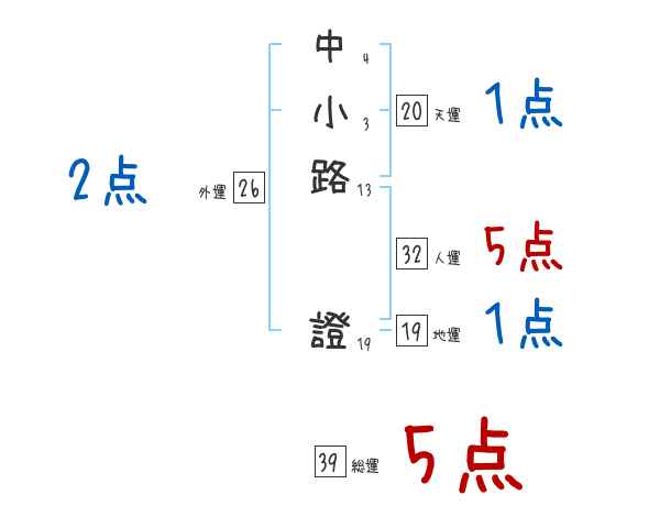 人運![]() | 中小路證さんの人運は32画の5つ星!柔軟性があり成功する。チャンスが多く金運が良い。 性格や才能などを表す2番目に重要な運勢です。人間関係や協調性、社会的な成功に影響します。主に20歳から50歳ぐらいまでの中年期の運勢を表します。 |