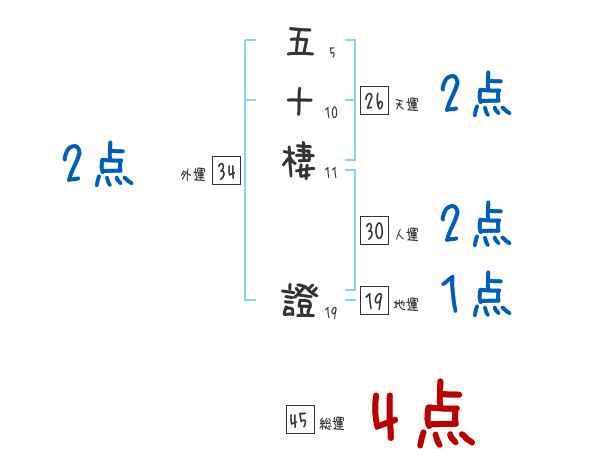 地運![]() | 五十棲證さんの地運は19画の1つ星!優れた才能を持ちますが、協調性が足りないことも。周りの人と協力する事を意識しましょう。 個性を表す基礎的な運勢です。性格形成や対人関係、行動力など家庭環境に影響されます。主に誕生してから20歳くらいまでの若年期の運勢を表します。 |