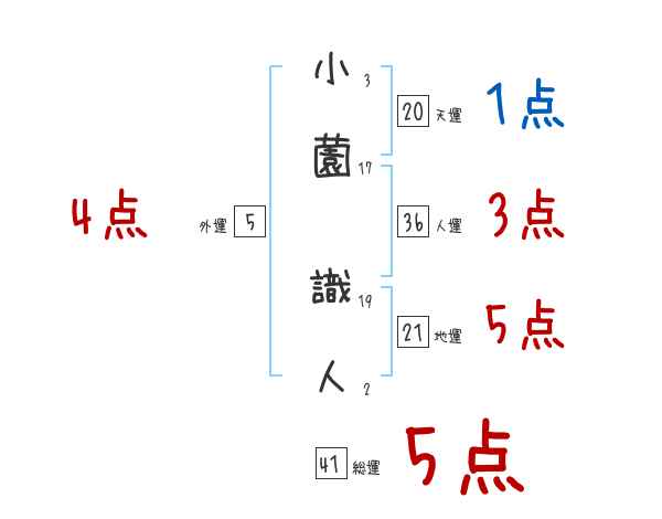 外運![]() | 小薗識人さんの外運は5画の4つ星!健康で安泰。協調性に優れ、財産に恵まれる。 生活面を象徴する運勢です。外部から受ける影響力を表し、結婚運、家庭運や職場、環境への順応性を表します。 |