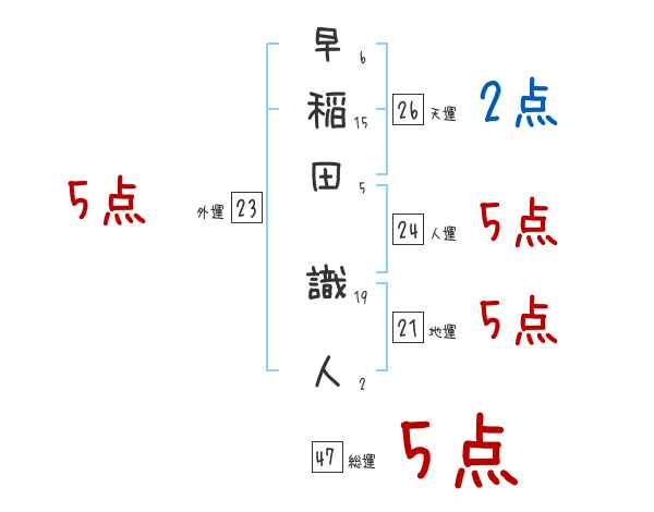 外運![]() | 早稲田識人さんの外運は23画の5つ星!想像力に優れ活力がある。一代で成功し名誉を手に入れる。 生活面を象徴する運勢です。外部から受ける影響力を表し、結婚運、家庭運や職場、環境への順応性を表します。 |
