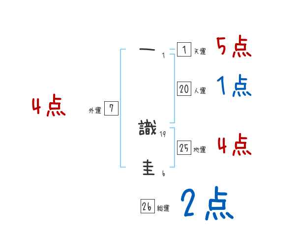 天運![]() | 一識圭さんの天運は1画の5つ星!行動力、指導力があり出世し繁栄する。幸運に恵まれる。 家系が持つ宿命的な運勢を表します。祖先から受け継いだ苗字ですので自分の力が及びません。家柄を象徴します。 |