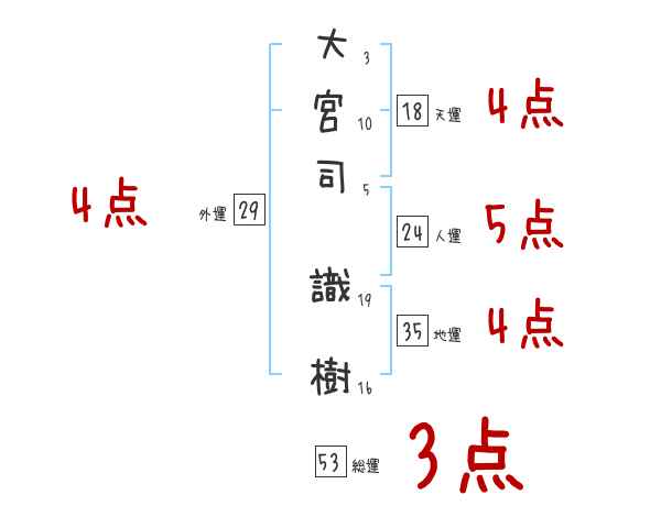 総運![]() | 大宮司識樹さんの総運は53画の3つ星!やや見栄っ張りで虚栄心がある。散財に注意。 あなたの人生を表す1番重要な運勢です。生涯を通じて影響する総合運となり、主に50歳以降の晩年期に影響を及ぼします。 |