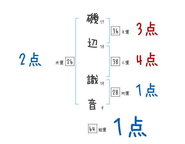 人運![]() | 磯辺識音さんの人運は38画の4つ星!温厚な性格で技術的な才能を発揮する。職人的な仕事に向いている。 性格や才能などを表す2番目に重要な運勢です。人間関係や協調性、社会的な成功に影響します。主に20歳から50歳ぐらいまでの中年期の運勢を表します。 |