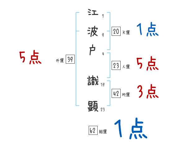 外運![]() | 江波戸識顕さんの外運は39画の5つ星!社交性に優れ人望が厚い。人の上に立ち成功する。 生活面を象徴する運勢です。外部から受ける影響力を表し、結婚運、家庭運や職場、環境への順応性を表します。 |