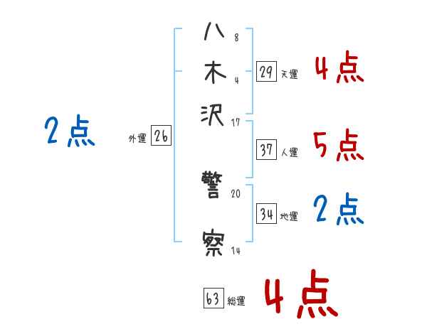 総運![]() | 八木沢警察さんの総運は63画の4つ星!家庭運がよく順調な生活。温和な性格。 あなたの人生を表す1番重要な運勢です。生涯を通じて影響する総合運となり、主に50歳以降の晩年期に影響を及ぼします。 |