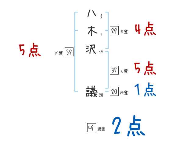外運![]() | 八木沢議さんの外運は32画の5つ星!柔軟性があり成功する。チャンスが多く金運が良い。 生活面を象徴する運勢です。外部から受ける影響力を表し、結婚運、家庭運や職場、環境への順応性を表します。 |