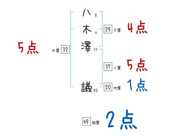 外運![]() | 八木澤議さんの外運は32画の5つ星!柔軟性があり成功する。チャンスが多く金運が良い。 生活面を象徴する運勢です。外部から受ける影響力を表し、結婚運、家庭運や職場、環境への順応性を表します。 |