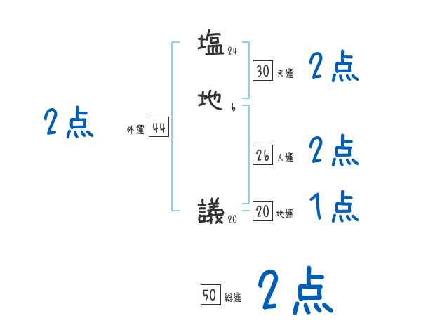 天運![]() | 塩地議さんの天運は30画の2つ星!浮き沈みの激しさに注意しましょう。 家系が持つ宿命的な運勢を表します。祖先から受け継いだ苗字ですので自分の力が及びません。家柄を象徴します。 |