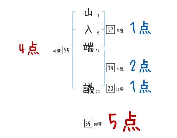 天運![]() | 山入端議さんの天運は19画の1つ星!優れた才能を持ちますが、協調性が足りないことも。周りの人と協力する事を意識しましょう。 家系が持つ宿命的な運勢を表します。祖先から受け継いだ苗字ですので自分の力が及びません。家柄を象徴します。 |