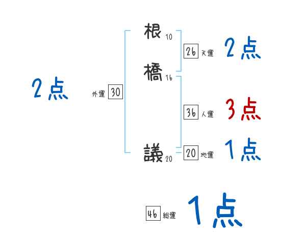 外運![]() | 根橋議さんの外運は30画の2つ星!浮き沈みの激しさに注意しましょう。 生活面を象徴する運勢です。外部から受ける影響力を表し、結婚運、家庭運や職場、環境への順応性を表します。 |