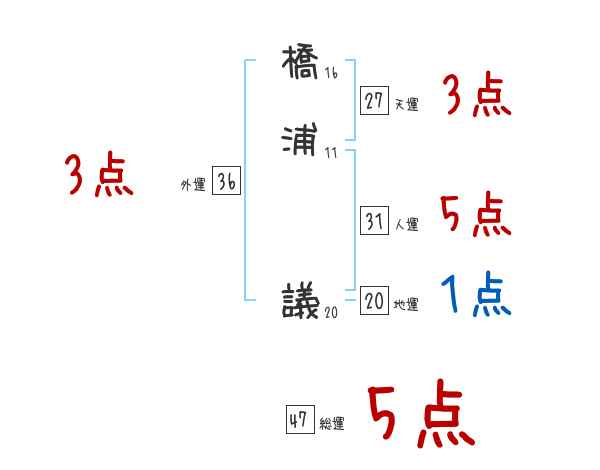 天運![]() | 橋浦議さんの天運は27画の3つ星!頭脳明晰だが強情で摩擦が多い傾向。孤立に注意。 家系が持つ宿命的な運勢を表します。祖先から受け継いだ苗字ですので自分の力が及びません。家柄を象徴します。 |