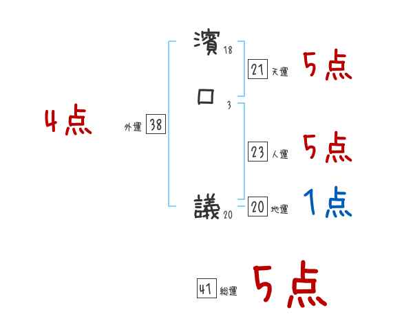 天運![]() | 濱口議さんの天運は21画の5つ星!統率力がある。独立し成功する。名誉を手に入れる。 家系が持つ宿命的な運勢を表します。祖先から受け継いだ苗字ですので自分の力が及びません。家柄を象徴します。 |