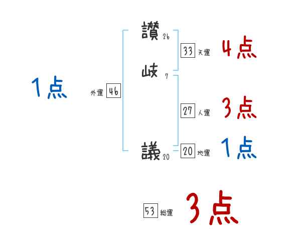 天運![]() | 讃岐議さんの天運は33画の4つ星!権力志向でプライドが高い。勇気があり運を切り開き成功する。 家系が持つ宿命的な運勢を表します。祖先から受け継いだ苗字ですので自分の力が及びません。家柄を象徴します。 |