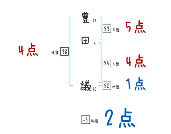 天運![]() | 豊田議さんの天運は23画の5つ星!想像力に優れ活力がある。一代で成功し名誉を手に入れる。 家系が持つ宿命的な運勢を表します。祖先から受け継いだ苗字ですので自分の力が及びません。家柄を象徴します。 |