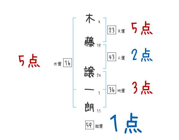 天運![]() | 木藤譲一朗さんの天運は23画の5つ星!想像力に優れ活力がある。一代で成功し名誉を手に入れる。 家系が持つ宿命的な運勢を表します。祖先から受け継いだ苗字ですので自分の力が及びません。家柄を象徴します。 |