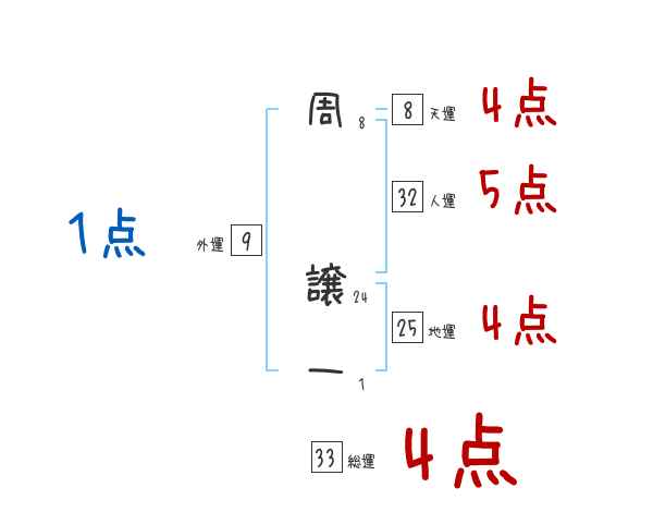 人運![]() | 周譲一さんの人運は32画の5つ星!柔軟性があり成功する。チャンスが多く金運が良い。 性格や才能などを表す2番目に重要な運勢です。人間関係や協調性、社会的な成功に影響します。主に20歳から50歳ぐらいまでの中年期の運勢を表します。 |