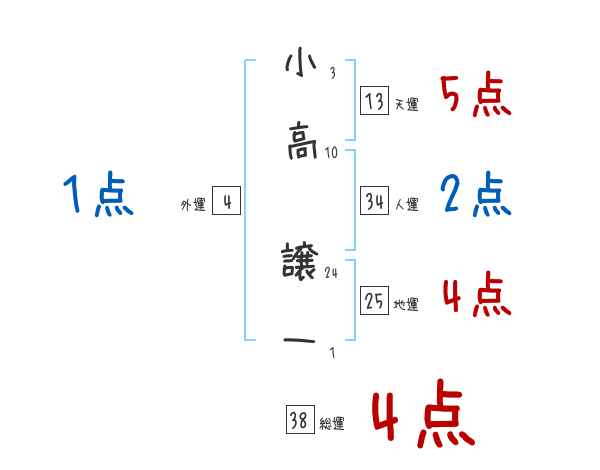 天運![]() | 小高譲一さんの天運は13画の5つ星!才能に恵まれ人気がある。名声を手に入れる。円満な人生。 家系が持つ宿命的な運勢を表します。祖先から受け継いだ苗字ですので自分の力が及びません。家柄を象徴します。 |