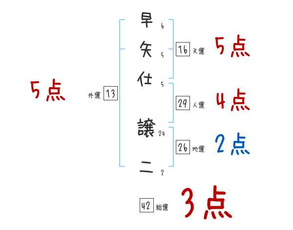 天運![]() | 早矢仕譲二さんの天運は16画の5つ星!人望が厚く大きく発展する。逆転成功が見える。 家系が持つ宿命的な運勢を表します。祖先から受け継いだ苗字ですので自分の力が及びません。家柄を象徴します。 |