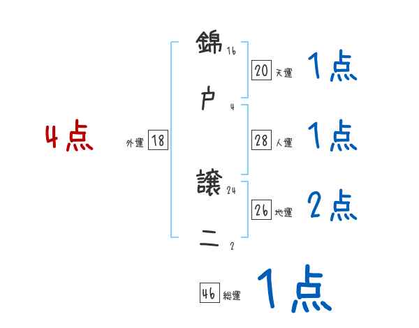 総運![]() | 錦戸譲二さんの総運は46画の1つ星!迷走することが多く苦労するかも。目先のことにとらわれないように。 あなたの人生を表す1番重要な運勢です。生涯を通じて影響する総合運となり、主に50歳以降の晩年期に影響を及ぼします。 |