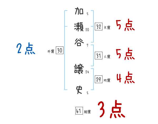 天運![]() | 加瀬谷譲史さんの天運は32画の5つ星!柔軟性があり成功する。チャンスが多く金運が良い。 家系が持つ宿命的な運勢を表します。祖先から受け継いだ苗字ですので自分の力が及びません。家柄を象徴します。 |