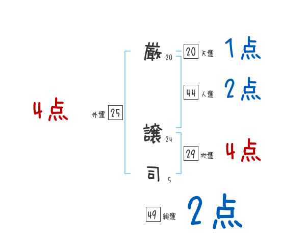 人運![]() | 厳譲司さんの人運は44画の2つ星!誠実で慎重な性格。物事を考えすぎないように注意しましょう。 性格や才能などを表す2番目に重要な運勢です。人間関係や協調性、社会的な成功に影響します。主に20歳から50歳ぐらいまでの中年期の運勢を表します。 |