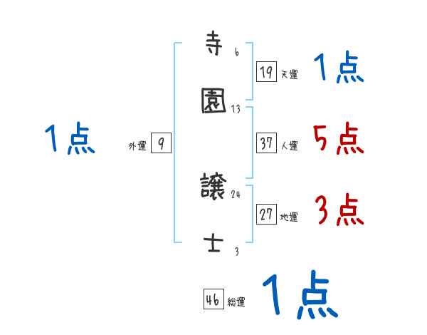 天運![]() | 寺園譲士さんの天運は19画の1つ星!優れた才能を持ちますが、協調性が足りないことも。周りの人と協力する事を意識しましょう。 家系が持つ宿命的な運勢を表します。祖先から受け継いだ苗字ですので自分の力が及びません。家柄を象徴します。 |