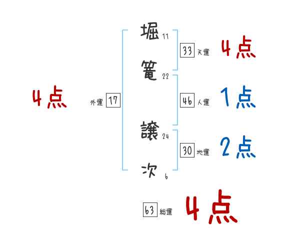 外運![]() | 堀篭譲次さんの外運は17画の4つ星!積極的な行動力。地位を気づき財産を手に入れる。純粋な心と直感力。 生活面を象徴する運勢です。外部から受ける影響力を表し、結婚運、家庭運や職場、環境への順応性を表します。 |