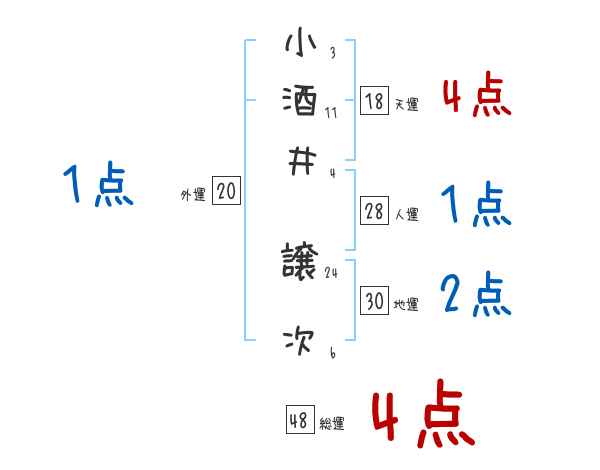 天運![]() | 小酒井譲次さんの天運は18画の4つ星!情熱的で剛気。忍耐力があり信頼される。 家系が持つ宿命的な運勢を表します。祖先から受け継いだ苗字ですので自分の力が及びません。家柄を象徴します。 |