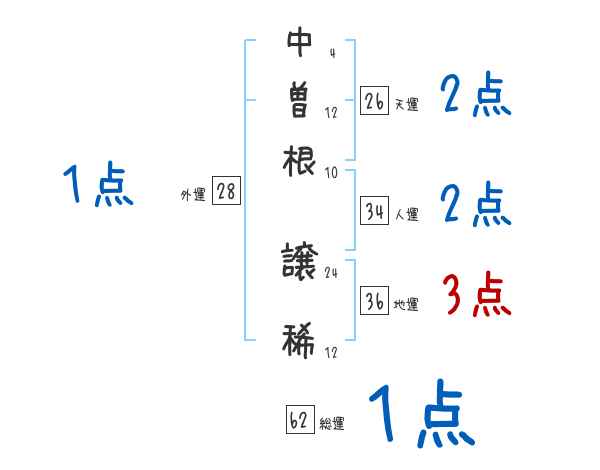外運![]() | 中曽根譲稀さんの外運は28画の1つ星!家庭環境に注意。スポーツで活躍できる能力があるかも。 生活面を象徴する運勢です。外部から受ける影響力を表し、結婚運、家庭運や職場、環境への順応性を表します。 |