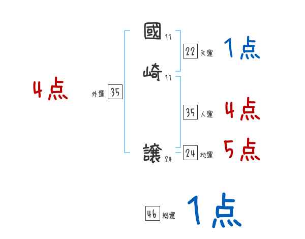 外運![]() | 國崎譲さんの外運は35画の4つ星!温厚な性格で感受性が高い。穏和な性格で人望が厚い。 生活面を象徴する運勢です。外部から受ける影響力を表し、結婚運、家庭運や職場、環境への順応性を表します。 |