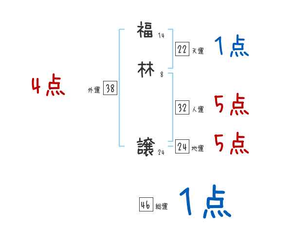人運![]() | 福林譲さんの人運は32画の5つ星!柔軟性があり成功する。チャンスが多く金運が良い。 性格や才能などを表す2番目に重要な運勢です。人間関係や協調性、社会的な成功に影響します。主に20歳から50歳ぐらいまでの中年期の運勢を表します。 |
