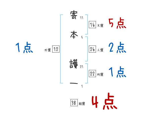 天運![]() | 寄本護一さんの天運は16画の5つ星!人望が厚く大きく発展する。逆転成功が見える。 家系が持つ宿命的な運勢を表します。祖先から受け継いだ苗字ですので自分の力が及びません。家柄を象徴します。 |