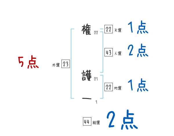 天運![]() | 権護一さんの天運は22画の1つ星!努力することが苦手ないっぽう手先が器用。芸術性にも優れる。 家系が持つ宿命的な運勢を表します。祖先から受け継いだ苗字ですので自分の力が及びません。家柄を象徴します。 |
