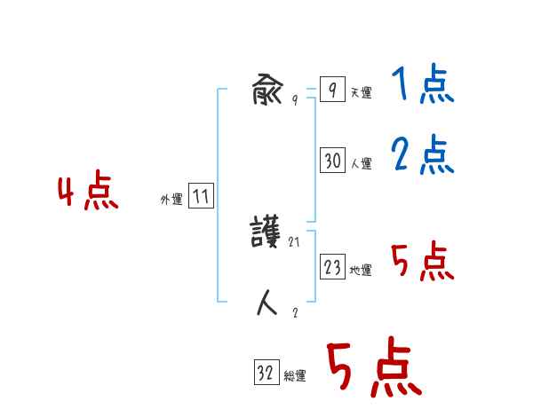 天運![]() | 兪護人さんの天運は9画の1つ星!消極的で才能を発揮することが苦手なことも。周りの意見に耳を傾けましょう。 家系が持つ宿命的な運勢を表します。祖先から受け継いだ苗字ですので自分の力が及びません。家柄を象徴します。 |