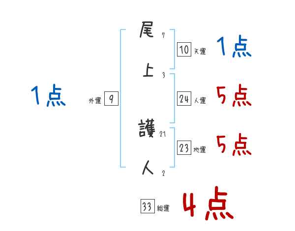 外運![]() | 尾上護人さんの外運は9画の1つ星!消極的で才能を発揮することが苦手なことも。周りの意見に耳を傾けましょう。 生活面を象徴する運勢です。外部から受ける影響力を表し、結婚運、家庭運や職場、環境への順応性を表します。 |