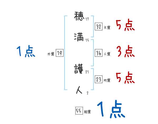 天運![]() | 穂満護人さんの天運は32画の5つ星!柔軟性があり成功する。チャンスが多く金運が良い。 家系が持つ宿命的な運勢を表します。祖先から受け継いだ苗字ですので自分の力が及びません。家柄を象徴します。 |