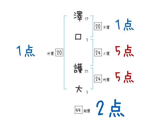 総運![]() | 澤口護大さんの総運は44画の2つ星!誠実で慎重な性格。物事を考えすぎないように注意しましょう。 あなたの人生を表す1番重要な運勢です。生涯を通じて影響する総合運となり、主に50歳以降の晩年期に影響を及ぼします。 |